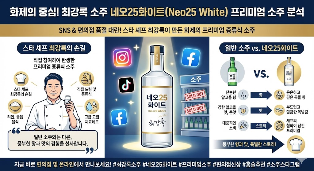 최근 SNS와 편의점 주류 코너를 중심으로 큰 화제를 모으고 있는 술이 있습니다. 바로 최강록 소주 네오25화이트(Neo25 White)입니다. 이 제품은 스타 셰프 최강록이 직접 참여해 만든 프리미엄 증류식 소주로, 일반 소주보다 향과 맛, 그리고 스토리가 훨씬 풍부하다는 점에서 소비자들의 관심을 끌고 있습니다.