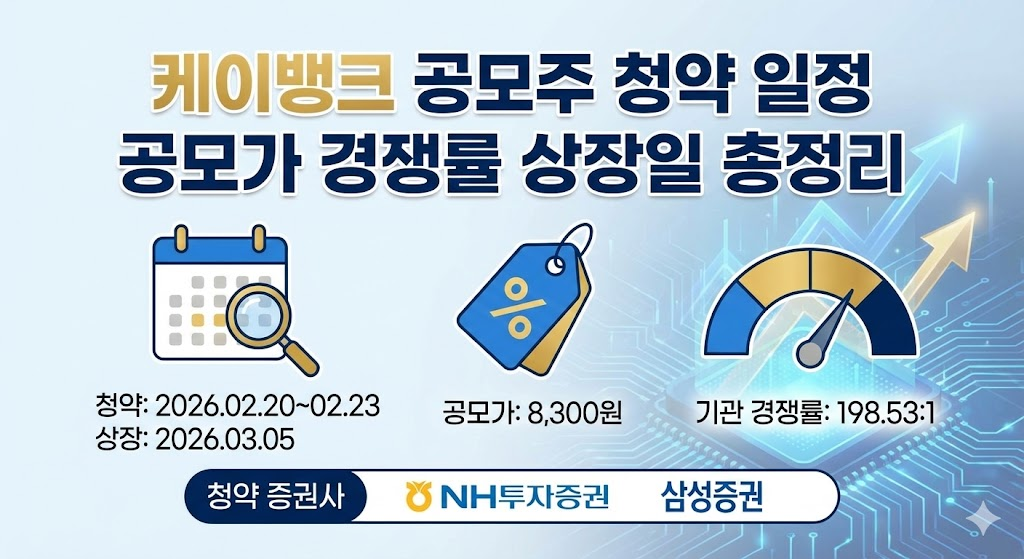케이뱅크 공모주는 2026년 2월 20일부터 23일까지 청약이 진행되며, 공모가는 8,300원으로 확정됐다. 기관 경쟁률은 198.53 대 1로 집계되었고, 상장일은 2026년 3월 5일이다. 청약은 NH투자증권과 삼성증권에서 가능하다.