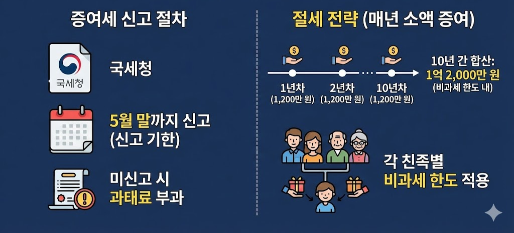 증여세는 비과세 한도를 초과하는 금액에 대해 부과되며, 연말정산과는 별도로 자진 신고·납부해야 합니다. 부모가 자 녀에게 주식, 현금, 금융자산 등을 넘겼을 때는 해당 연도 5월 말까지 국세청에 신고해야 하며, 미신고 시 과태료 및 벌금이 부과될 수 있습니다.