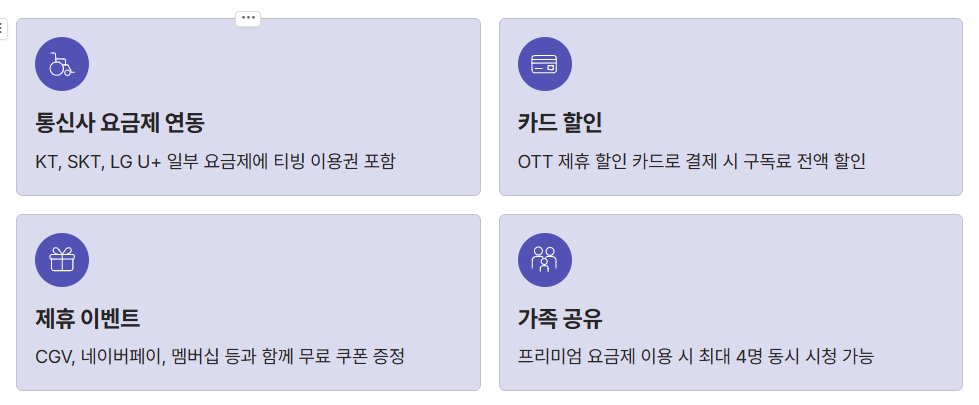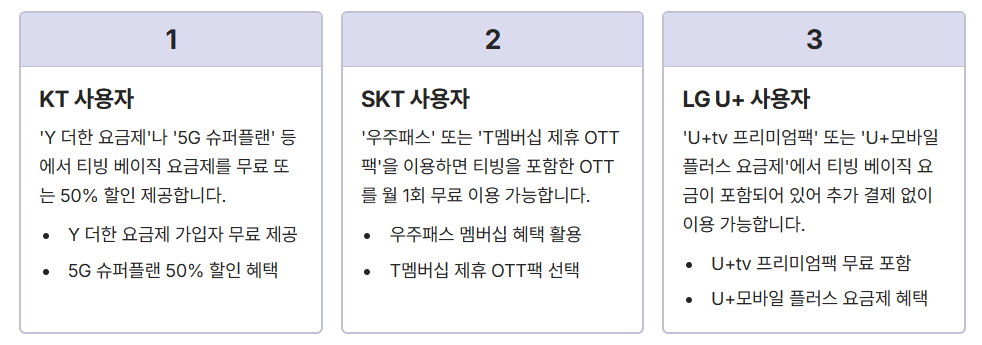 | 통신사 요금제 연동 | KT, SKT, LG U+ 일부 요금제에 티빙 이용권 포함 |