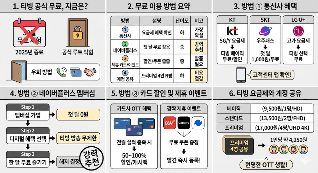티빙의 한 달 free 이벤트는 사라졌지만, 통신사 연동, 카드 할인, 제휴 쿠폰 활용만 잘 알아두면 충분히 한 달 free에 가까운 혜택을 누릴 수 있습니다. 특히 OTT를 자주 보는 분이라면 자신의 요금제나 카드 혜택을 꼼꼼히 확인하는 게 포인트예요.