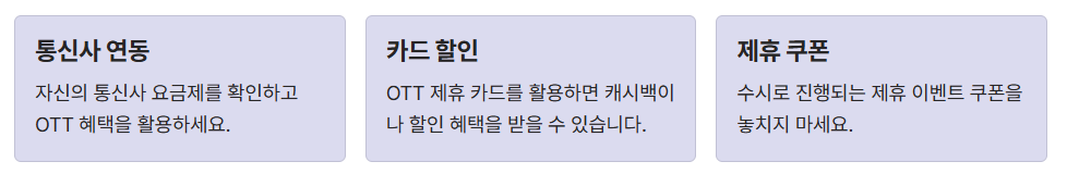 | 카드 할인 | OTT 제휴 할인 카드로 결제 시 구독료 전액 할인 |