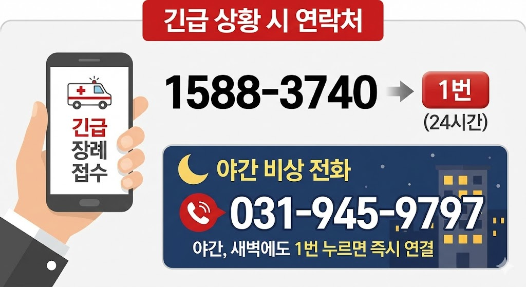 야간이나 새벽에도 1번을 누르면 즉시 담당 지점으로 연결되어 장례 접수, 운구, 장지 문의 등 긴급 상황에 대응이 가능합니다.