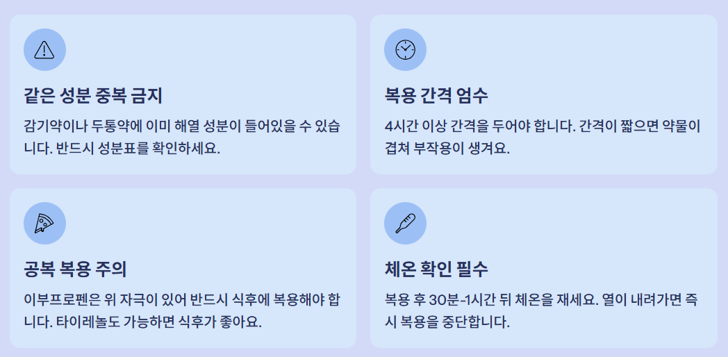 감기약이나 두통약에 이미 해열 성분이 포함된 경우가 많습니다.