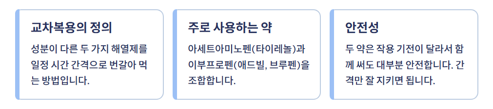 감기나 독감으로 열이 높을 때, 한 가지 해열제를 먹어도 체온이 잘 내려가지 않으면 “다른 약을 함께 먹어도 될까?” 하고 고민하게 됩니다. 이럴 때 등장하는 방법이 바로 해열제 교차복용이에요. 하지만 정확한 복용 간격과 원리를 모르면 오히려 부작용을 일으킬 수 있습니다. 오늘은 해열제 교차복용의 개념, 안전한 방법, 그리고 피해야 할 조합까지 정확하게 알려드릴게요.