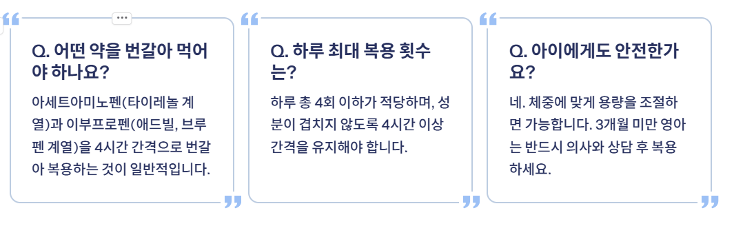 | 소아 | 아세트아미노펜 시럽 | 이부프로펜 시럽 | 4~6시간 간격 | 체중별 용량 준수 |