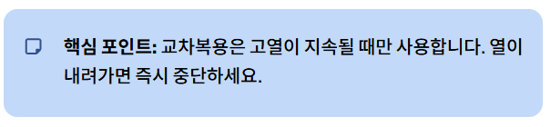 | 소아 | 아세트아미노펜 시럽 | 이부프로펜 시럽 | 4~6시간 간격 | 체중별 용량 준수 |