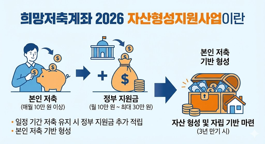 희망저축계좌 2026은 근로소득이나 사업소득이 있는 저소득 가구의 자산 형성과 자립을 지원하는 제도다. 매월 10만 원 이상 貯蓄 하면 정부가 월 10만 원에서 최대 30만 원까지 추가 적립해준다.