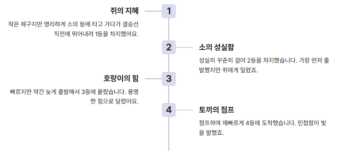• 호랑이는 빠르지만 약간 늦게 출발해서 3등,