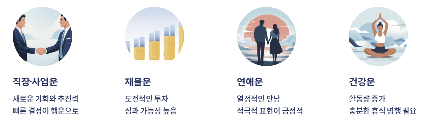 | 직장·사업 | 추진력, 성과 | 새로운 기회와 빠른 전개가 유리 |