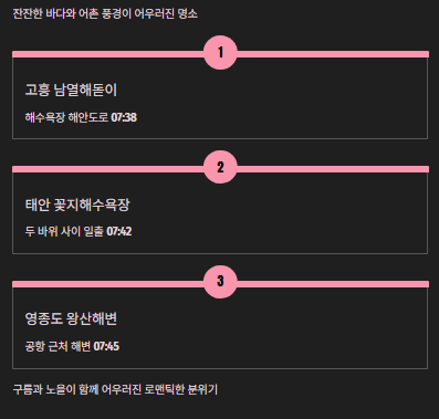 | 섭지코지 | 약 7:35 | 드라마 촬영지, 낭만적인 풍경 |