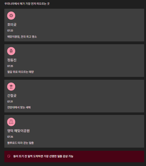 | 지역 | 대표 명소 | 예상 일출시간 |