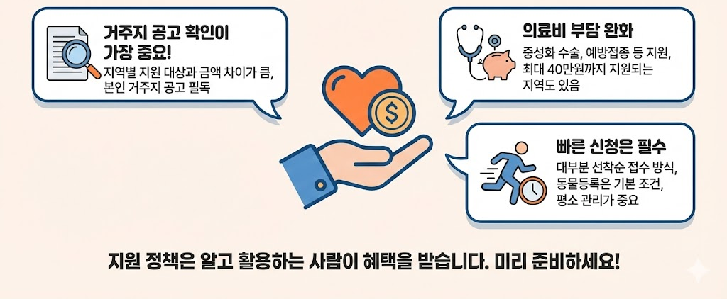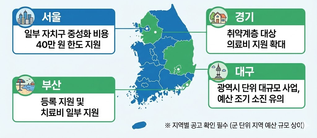 서울 일부 자치구는 중성화 비용 40만 원 한도 지원을 진행한다. 경기도는 취약계층 대상 의료비 지원을 확대했다. 부산은 등록 지원과 치료비 일부를 지원한다.