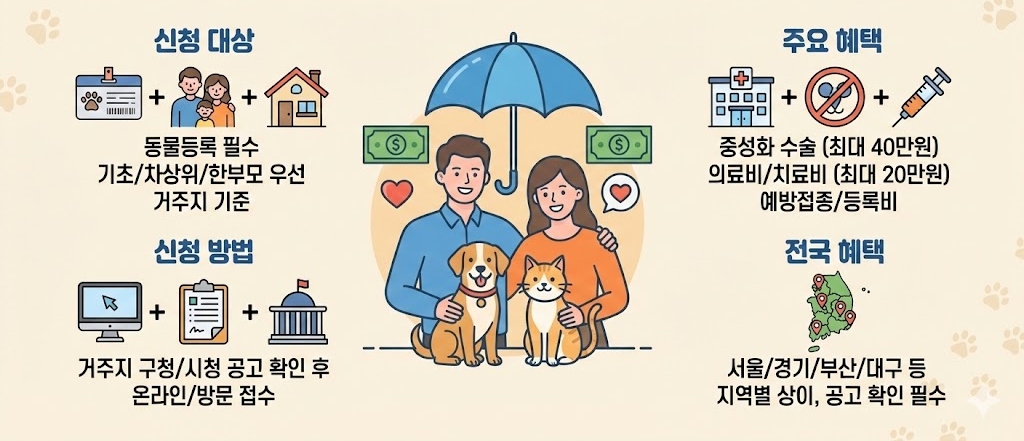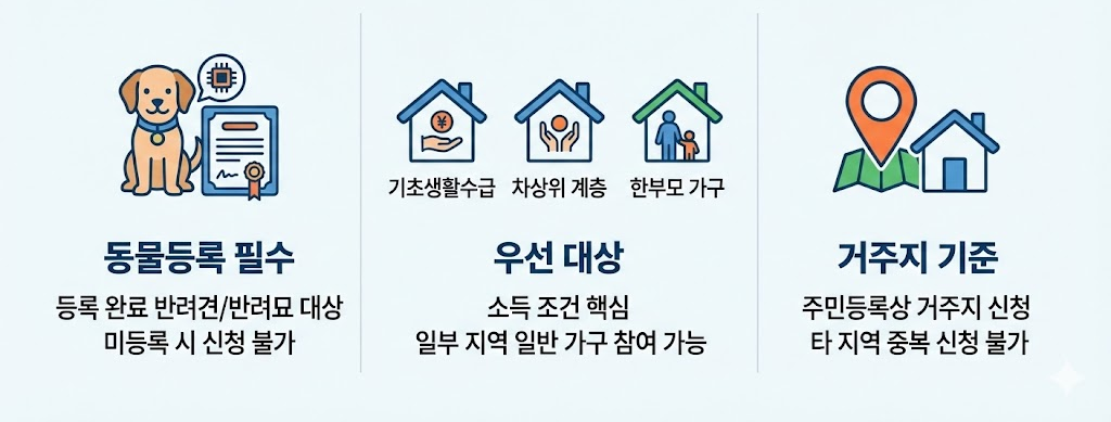 2026 반려 動物 지원금은 소득 조건과 등록 여부가 핵심이다. 거주지 기준으로 신청이 가능하다. 타 지역 사업은 중복 신청이 불가하다.