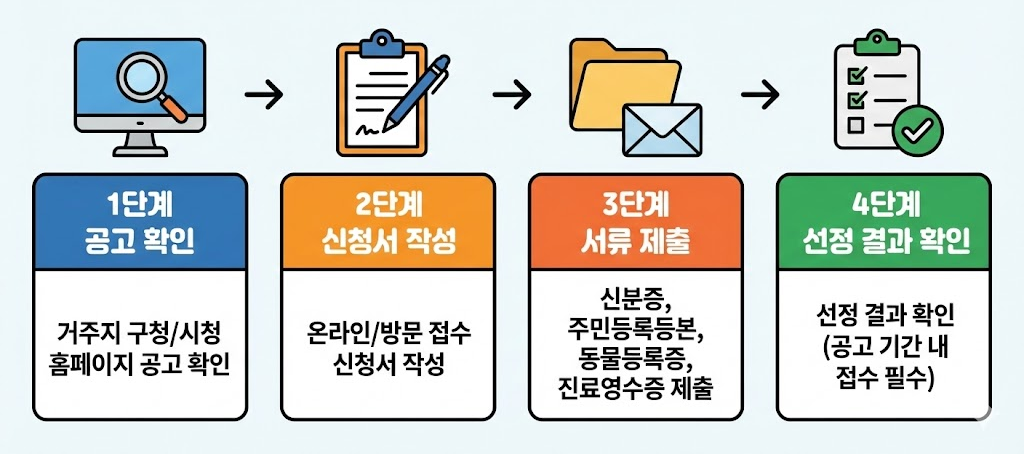 2026 반려동물 지원금 신청 방법은 공고 기간 내 접수가 중요하다. 기간을 놓치면 다음 차수를 기다려야 한다.