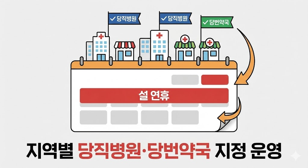 설 연휴에는 모든 의료기관이 동시에 쉬지 않습니다. 지역별로 당직병원과 당번약국을 지정해, 응급 상황이나 간단한 진료·처방이 가능하도록 운영합니다.