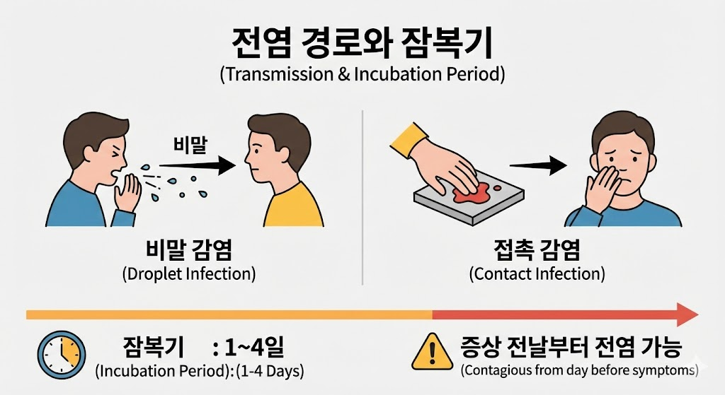 기침이나 재채기를 통해 바이러스가 퍼지며, 손을 통해 간접 전염되기도 합니다.