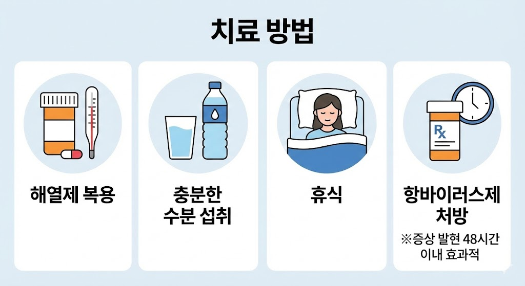 치료는 증상 완화와 항바이러스제 투여가 중심입니다.