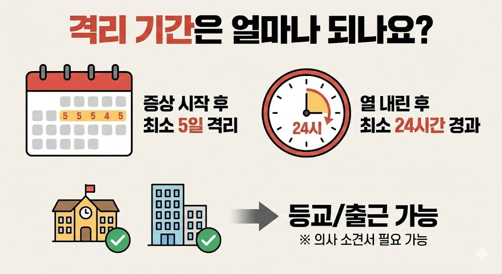 특히 열이 떨어진 후 최소 24시간이 지나야 등교나 출근이 가능합니다.
